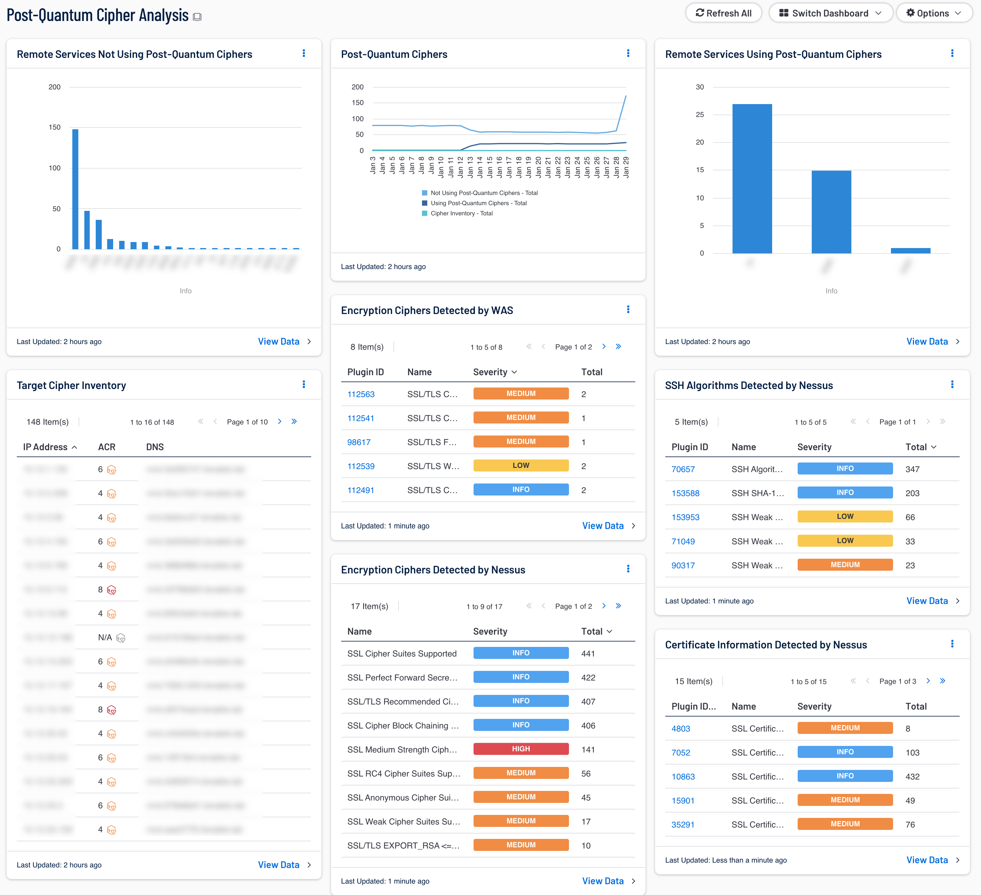 - Target Cipher Inventory - This table utilizes the Target Cipher Inventory plugin which collects cryptographic ciphers and algorithms discovered during a Nessus scan. Using the IP Summary tool, this widget provides a per asset inventory of ciphers and algorithms.